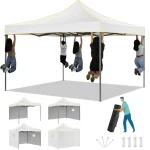 - 【Sun Protection Fabric】The tent for parties is made of high-density 410D Oxford polyester fabric, with silver-plated PU lining, waterproof and sunscreen(UPF 50+), which can blocks 99% of the sun’s harmful rays. 【Sturdy Metal Frame】The tent for backyard is constructed by all steel frame.The metal legs measure 30x30mm and are 0.6mm thick, which is strong, durable and rust-resistant.【Easy to Set Up and Take Down】Pop up canopy 10×10 comes with a folding metal base. Unfold the metal base and secure the fabric cover. There are metal buttons on each corner that you press to lock the canopy in place. Then use the buttons on the legs to easily adjust the height, 3 levels of adjustment to choose. 2 people can do it in 5 minutes. It’s just as quick to take down.【Removable Sidewalls】The easy up canopy 10×10 has 4 detachable side walls. With Hook-and-loop fastener, you can add or detach 2, 3 or even all side walls in different occasions, to get great flexibility and more user options. Widely used for outdoor camping, backyard gathering, marketing event, beach shade, birthday parties and more.【Packing List & Warranty Service】1*Pop Up Canopy Frame, 1*10x10FT Canopy Top Cover, 4xGround Nails, 4xWind Ropes, 1x Carry Bag, 1x Manual. We provide warranty service, if you have any questions with Hoteel pop up tent 10×10, please feel free to contact us. We will solve it for you immediately.