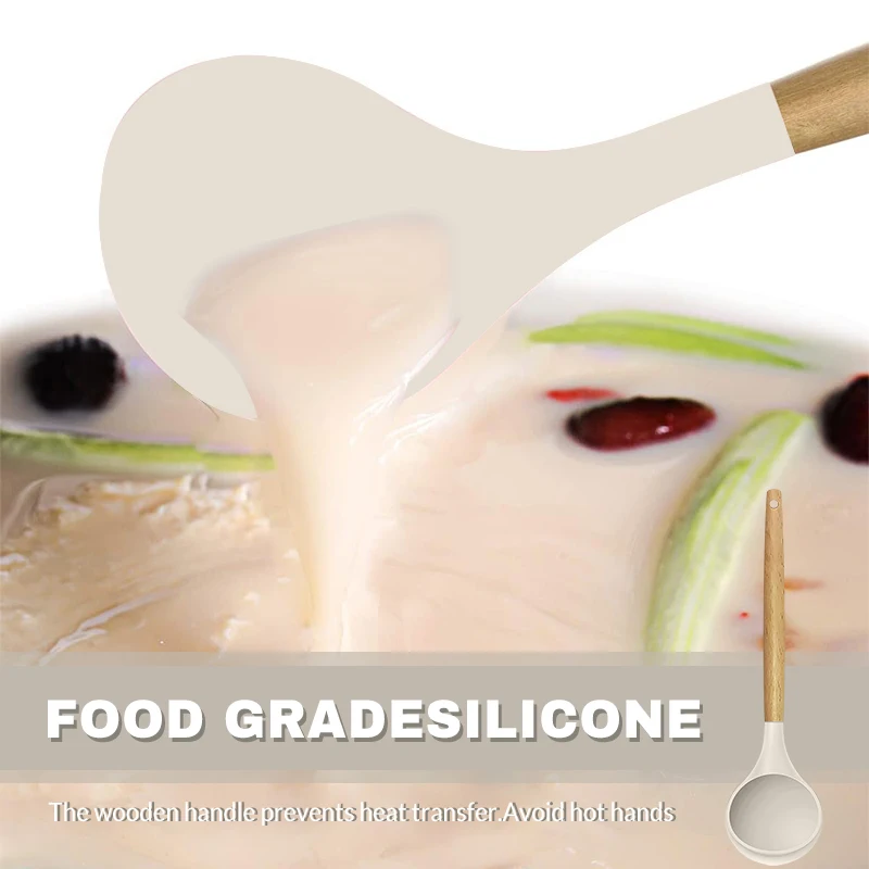 【About Product Design】: Silicone material, high temperature resistance, not easy to damage the pots and pans; wooden handle, fit the palm, extended design, not easy to burn your hands, use a long time without fatigue.