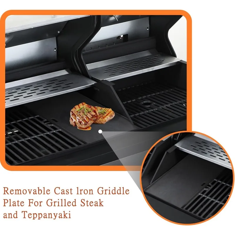 - User Friendly Design: This gas and charcoal combo grill features the integrated automatic easy ignition system in the gas grill side,quick start up with the push-and-turn of a control knob, and built-in stainless steel temperature gauges (100–800°F) on both sides for precise heat control,ideal for smoking, searing, slow cooking and grill . Barbecue Grill Perfect for grill masters and outdoor chefs.The indoor and outdoor grills & smokers has the Push off Carbon Dust and Drop Grease Tray.Easy to clean, Say Goodbye to Carbon Dust and Drop Grease